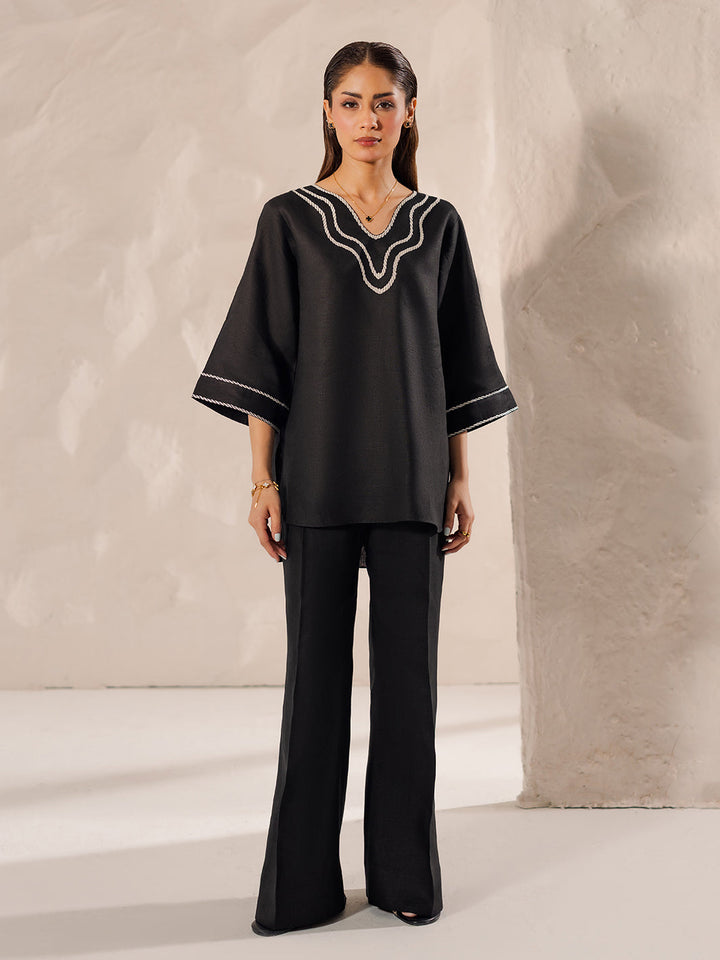 The deep black hue, paired with minimal white embroidery, creates a bold contrast that feels polished yet understated. The relaxed silhouette drapes gracefully, allowing for movement, ease, and all-day comfort, whether you’re on the go or off-duty.