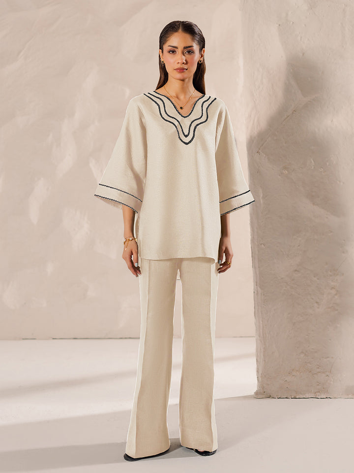 Design Features: Relaxed silhouette, embroidered neckline & sleeves, wide-leg trousers