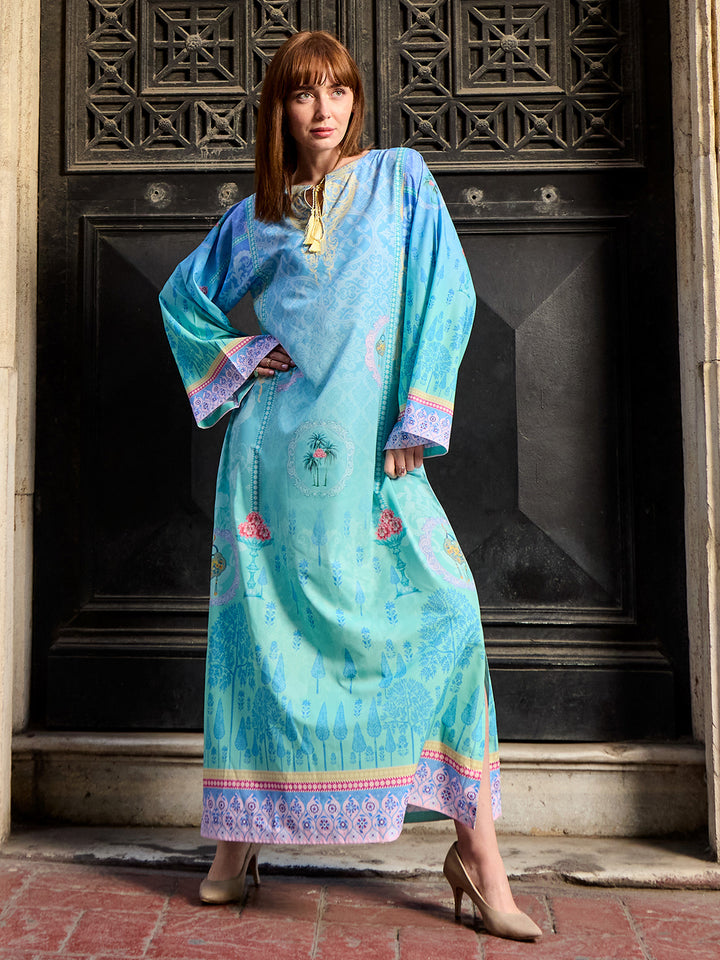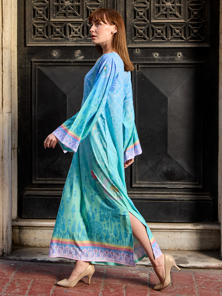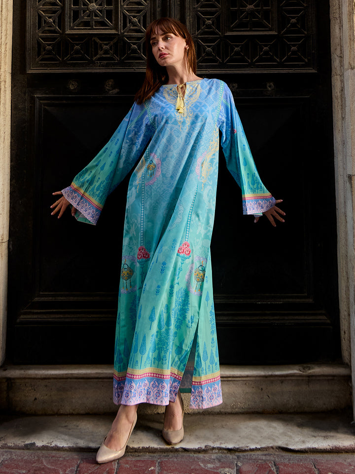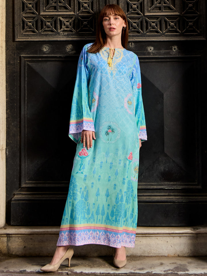 Step into modern elegance with Viana, a statement eastern women’s kaftan crafted in luxurious Crepe Polyester. The rich teal base paired with intricate geometric borders creates a bold yet graceful look. Its airy, flowy cut ensures all-day comfort, making it perfect for fall get-togethers, casual outings, or evening events with effortless sophistication.