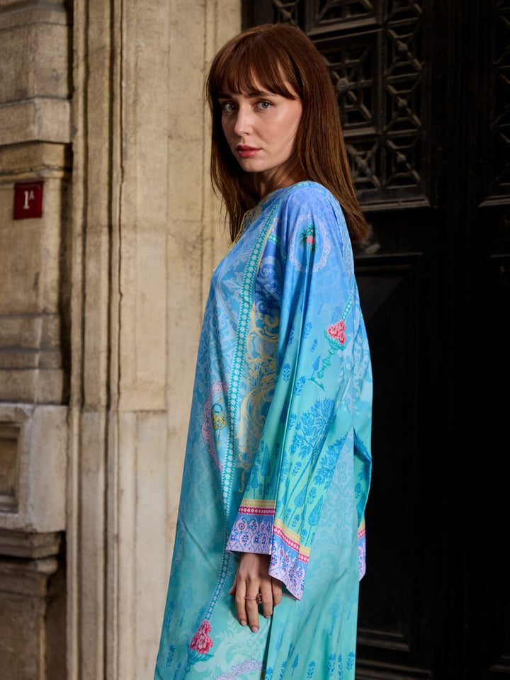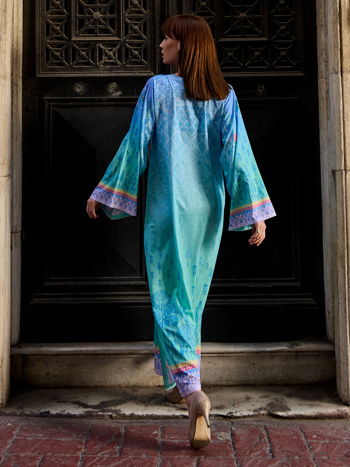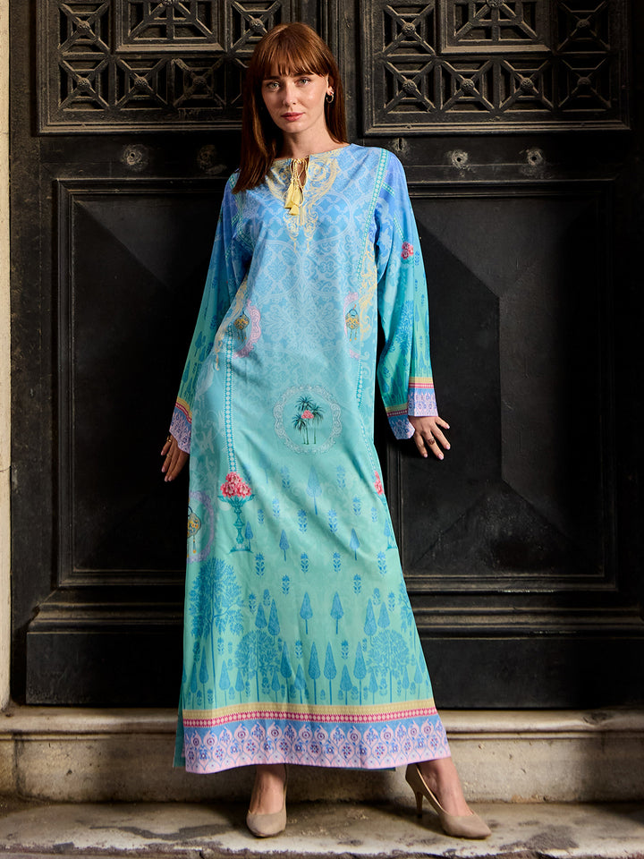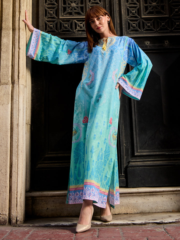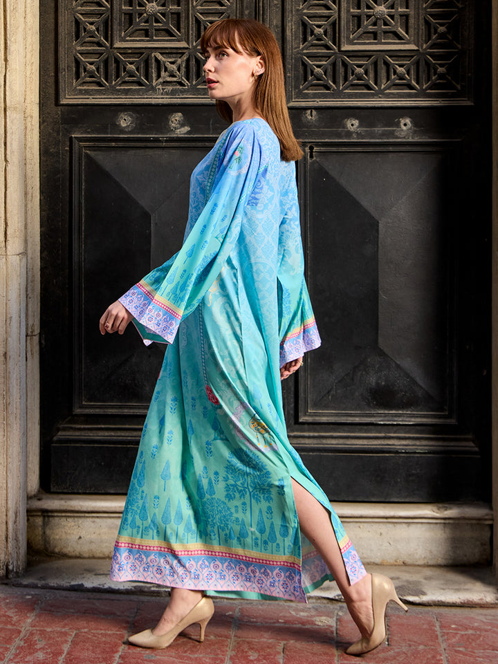 Step into modern elegance with Viana, a statement eastern women’s kaftan crafted in luxurious Crepe Polyester. The rich teal base paired with intricate geometric borders creates a bold yet graceful look. Its airy, flowy cut ensures all-day comfort, making it perfect for fall get-togethers, casual outings, or evening events with effortless sophistication.