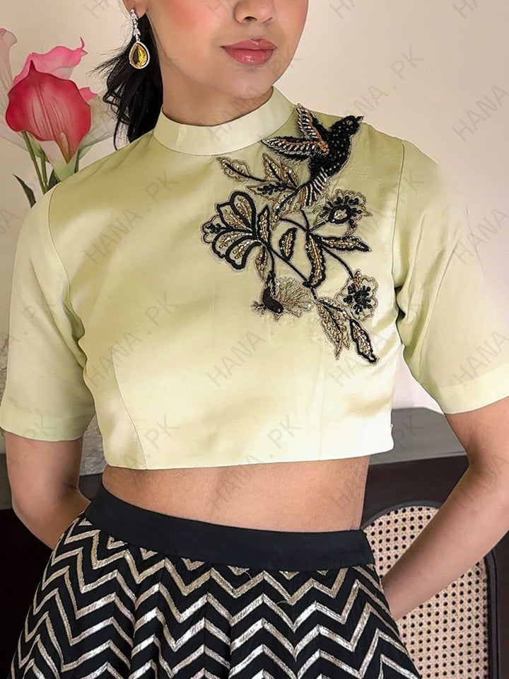 Elegant pastel Pure Viscose Organza Satin crop blouse with detailed floral hand embellishment