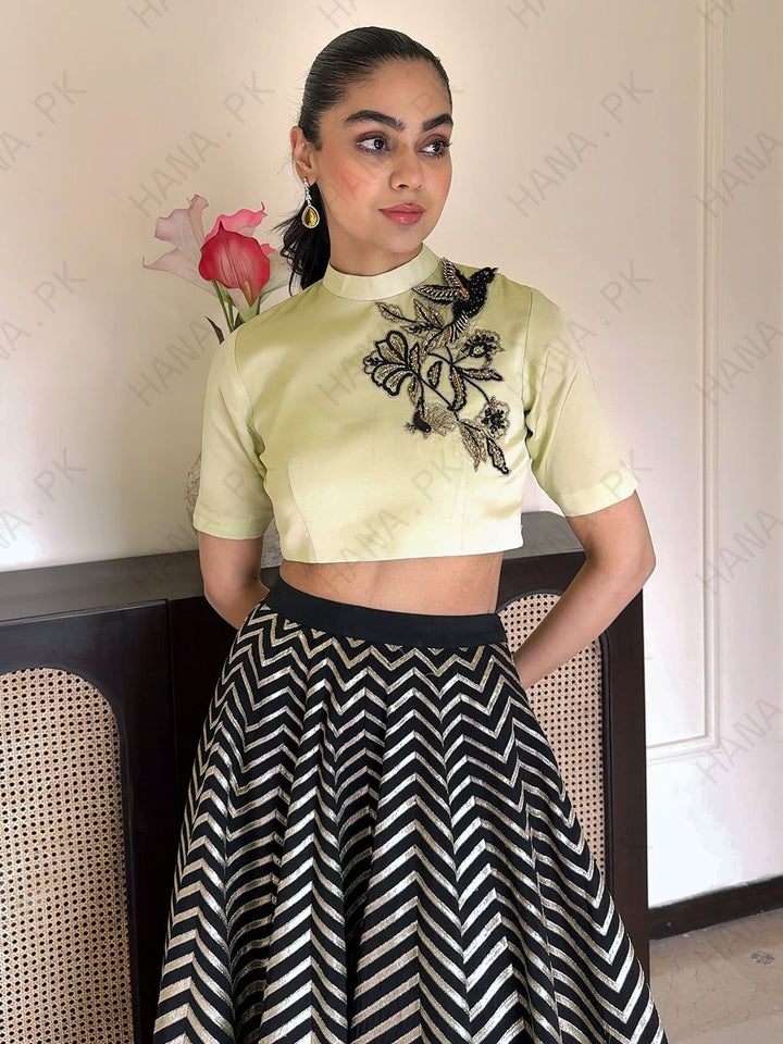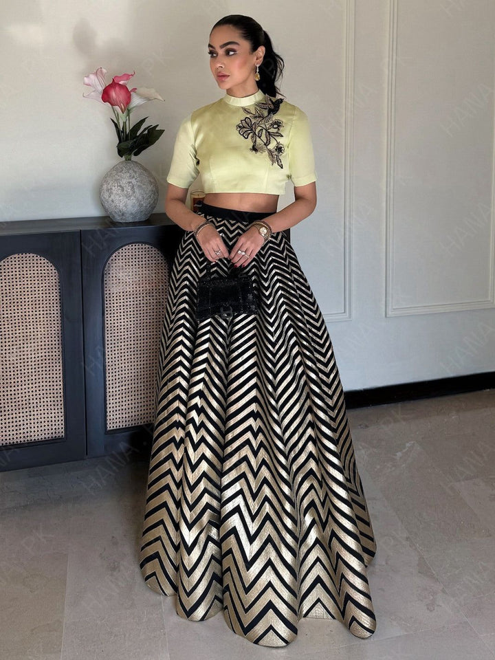 Turn heads with Zarea, a luxurious fusion ensemble crafted for the modern muse. Featuring a high-neck satin crop top in a soft pastel hue adorned with intricate floral embroidery, paired with a bold black and gold chevron lehenga, this outfit blends contemporary elegance with traditional charm.